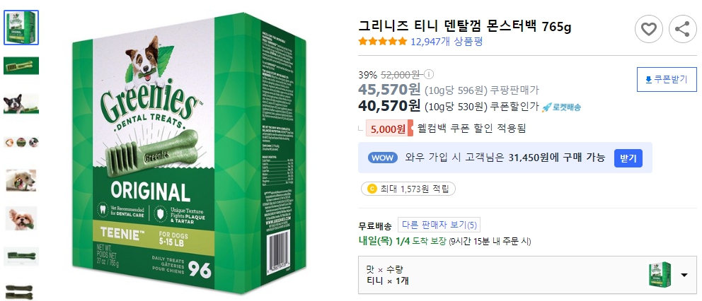 그리니즈 티니 덴탈껌은 반려견들이 좋아하는 간식 중 하나입니다. 이 껌은 치석제거 효과가 뛰어나기로 유명한데요, 미국 FDA 승인과 한국 식약처 인증을 받은 안전한 성분이기 때문에 안심하고 급여하셔도 됩니다. 하지만 너무 많이 급여하면 설사나 구토를 유발할 수 있으니 하루 권장량을 지켜주셔야 합니다. 또한 개껌 종류마다 크기가 다르기 때문에 소형견에게는 작은 사이즈인 쁘띠뜨사이즈를 추천드립니다. 강아지에게 양치질 대신해서 줘도 되나요? 네 물론입니다! 칫솔질 없이 간편하게 치아관리를 해줄 수 있다는 장점이 있지만 모든 구강질환 예방 및 치료 목적으로는 적합하지 않습니다. 다만 입냄새 제거 등 보조적인 수단으로는 탁월하기 때문에 매일매일 꾸준히 급여하시는 것을 권장드려요. 개껌중에서도 기호성이 좋은 편인가..