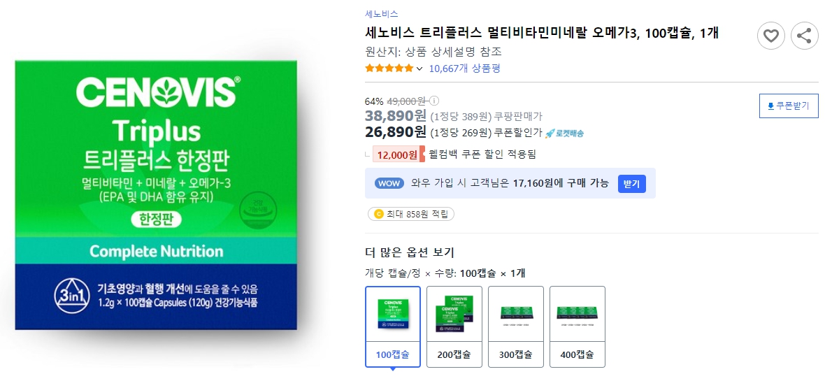 건강기능식품 시장규모가 점점 커지고 있고, 건강관리에 대한 관심이 높아지면서 다양한 종류의 건강기능식품들이 출시되고 있다. 우리나라 사람이라면 누구나 섭취해야 하는 필수 영양소인 비타민과 미네랄 그리고 혈행개선에 도움을 주는 오메가3 이 세가지 성분을 한 캡슐에 담은 영양제가 있다고 해서 소개하고자 한다. 세노비스 트리플러스 멀티비타민미네랄 오메가는 어떤가요? 우선 위 사진처럼 눈에 띄는 특징으로는 1캡슐당 11가지 주요 비타민과 6가지 미네랄 및 DHA/EPA 함유유지(오메가-3) 500mg 가 들어있는 프리미엄 복합영양제라는 점이다. 또한 식약처로부터 인정받은 13가지 기능성 원료 중 7가지 주원료 (멀티비타민+미네랄+오메가-3) 를 모두 함량까지 꽉 채운 믿을 수 있는 제품이라는 점도 눈여겨볼 만하..