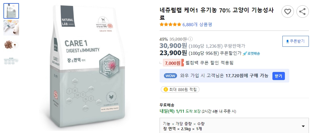 네츄럴랩 케어1 유기농 70% 고양이 기능성사료 최저가 구매하기